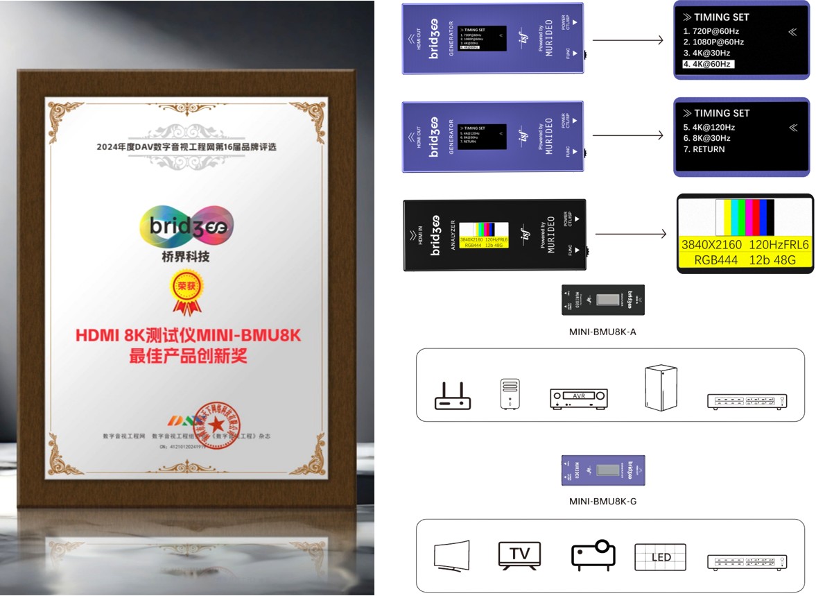 The MINI-BMU8K HDMI tester is a flagship product from Bridgee, backed by the renowned Murideo brand. It won the "Best Product Innovation Award" at the 16th AV Industry Brand Awards. It serves as a gold standard for AV engineers, manufacturers, testing organizations, and professional users. The MINI-BMU8K not only solves the problem of detecting fiber optic cable continuity but also tests every node in the HDMI system, including bandwidth, resolution, and key parameters for HDMI interfaces, matrices, and splitters. This functionality holds immense practical value for both the current and future AV industry.